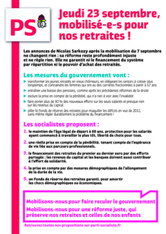 Martine Aubry, ce 23 septembre, a appellé à «utiliser tous les moyens pour faire pression sur le gouvernement». Elle a plaidé pour «une réforme qui règle définitivement le problème et qui soit juste». «92% de la réforme du gouvernement pèse sur les salariés et les retraités, 8% sur le capital, explique la première secrétaire. Ceux qui ont commencé tôt doivent pouvoir partir à 60 ans. Nous ne voulons pas que les femmes soient les premières victimes de cette réforme».